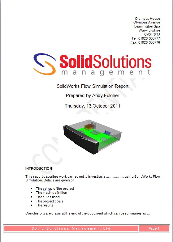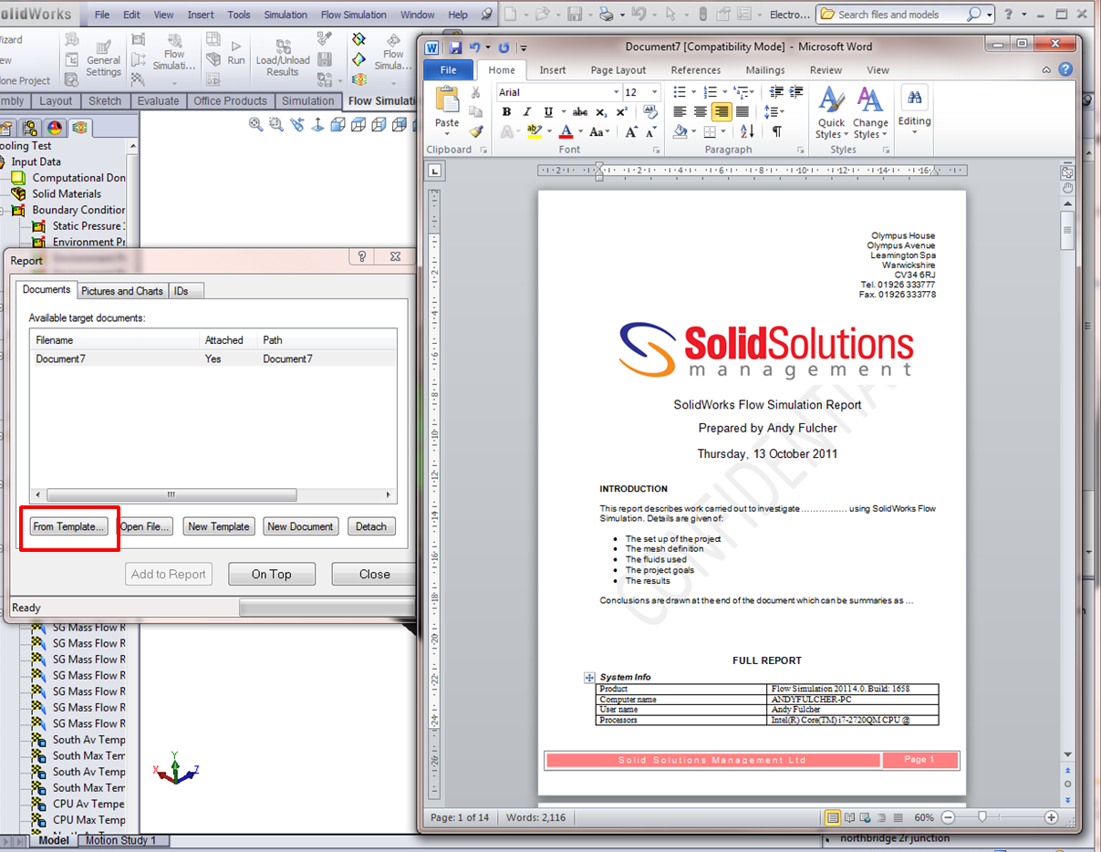 You may have seen my last blog about Simulation reports. Great! But what about reports in Flow Simulation? Well we can also create very neat custom reports in Flow. The report writer is different from the FEA Simulation but also produces great reports in Word. The report writer is accessed from the Flow drop down menu which then allows you to choose a template. There are a set of standard templates with a variety of options for what is included - from 'Results Only' to 'Full Report'. These templates can be modified. To do this, all you need to do is browse in Windows Explorer to the folder where they are stored which is typically ...