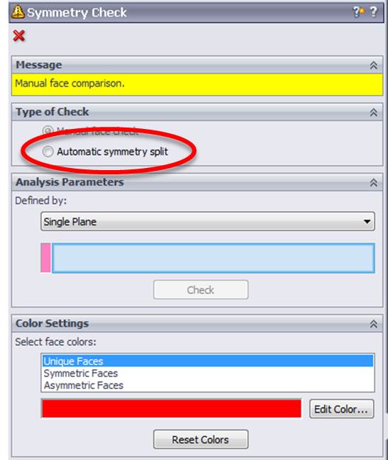 If you have SOLIDWORKS Professional or Premium, go to the command search at the top right of the window and type 'Symmetry Check' (will filter as you type).