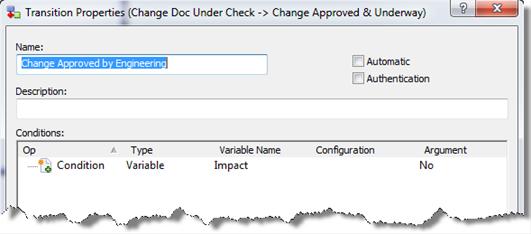 So when the User is in the State '....Under Check' he will see two, not three routes out and if he selects the 'Change Approved...' option the actual Transition taken will depend on the value of the Impact Variable.