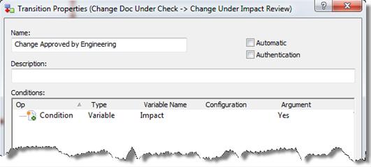 Lets say we have an Engineering Change Document that enters a Workflow where, dependant on the type of Change being proposed, a secondary 'Impact Review' may be required. We don't want the initial reviewer to consider this however so the file should be routed according to the metadata defined when the EC was generated. So on my DataCard I have a Variable called impact which is linked to a list that has two values Yes & No.