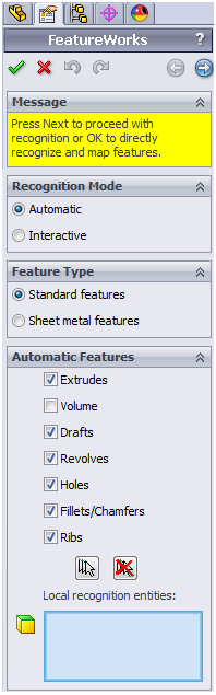 The FeatureWorks dialog box offers the identification of selected features such as extrudes, drafts and Hole Wizard features. FeatureWorks can also recognise Sheet Metal features such as sketched bends and hems.