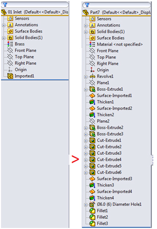 After running FeatureWorks, the FeatureManager tree will show all of the identified sketched and applied features. Editing is possible as with any other SOLIDWORKS part file, giving more flexibility to the editing that can be achieved with imported model geometry.