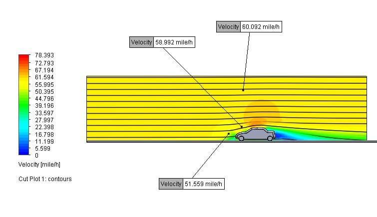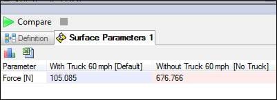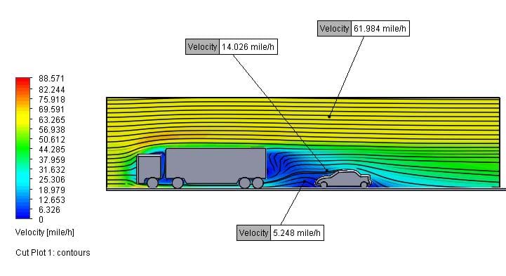 Having pondered this for a few days I ran a SOLIDWORKS Flow study to see the effect. In 2013 there are some great comparison tools that allow a side-by-side evaluation. Here are the visual comparisons and a table showing me that the drag force drops from 677N to 105N when in the wake of a truck - that is a whole lot of fuel saving!