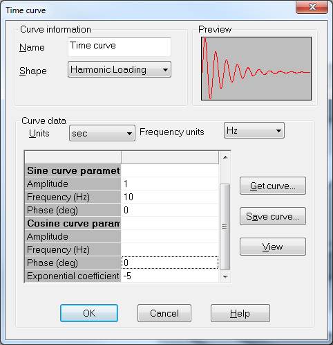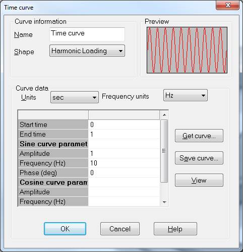 .... or (this is less well known) the drop down can be set to 'Harmonic Loading' to allow a sinusoidal oscillation of the load. The amplitude and frequency and phase can all be set. The preview shows a typical sine wave with a frequency of 10Hz  over a time period of 1 sec. .....
