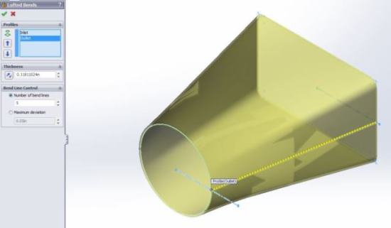 Below is an image of a standard Design Library lofted sheetmetal part. I have modified the profiles and you can see I now have control over the bend lines.
