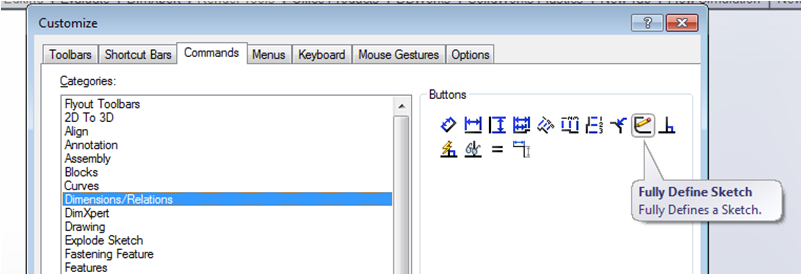 Fully Define Sketch is a command that is rarely used as it doesn’t appear as standard on the Sketch Toolbar and needs to be manually added.