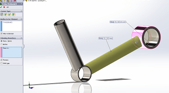 I have added in a second circular boss to demonstrate the end part of the Trim/Extend tool. The feature automatically recognises it needs to extend the Weldment to the face off the boss (highlighted pink), once again be sure to select which sections of the body are kept and discarded.