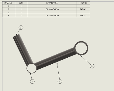 A further point about using Weldments in SOLIDWORKS; when the finished part is exported to a drawing a Weldment cut list can also be added to the sheet as shown below, to which I have also added balloons.