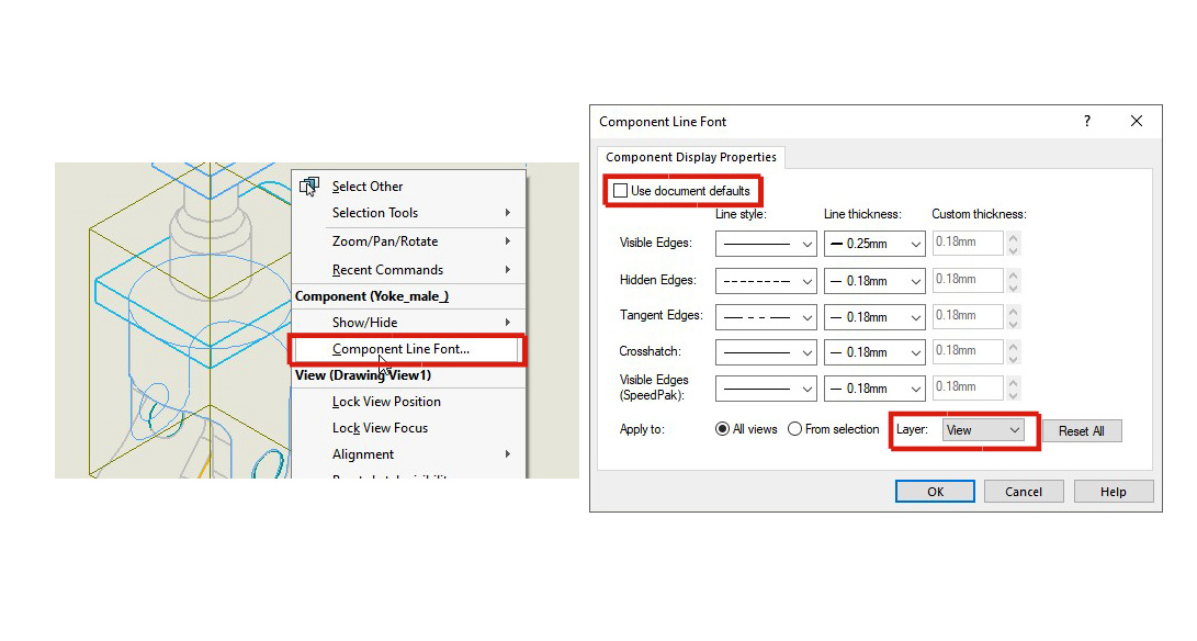 To assign the specific view or part model within the view to this layer, right click and then choose Component Line Font. Deselect the Use Document Defaults checkbox and then choose the layer of choice.