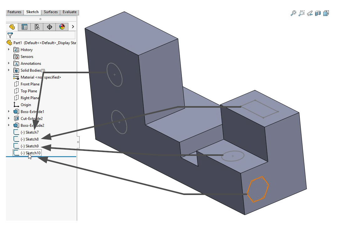 Once you have finished sketching you will notice that SOLIDWORKS has created a new sketch for each time you started to sketch on a different face. These can then be used as normal to then complete extrusions or any other feature you wish to create.