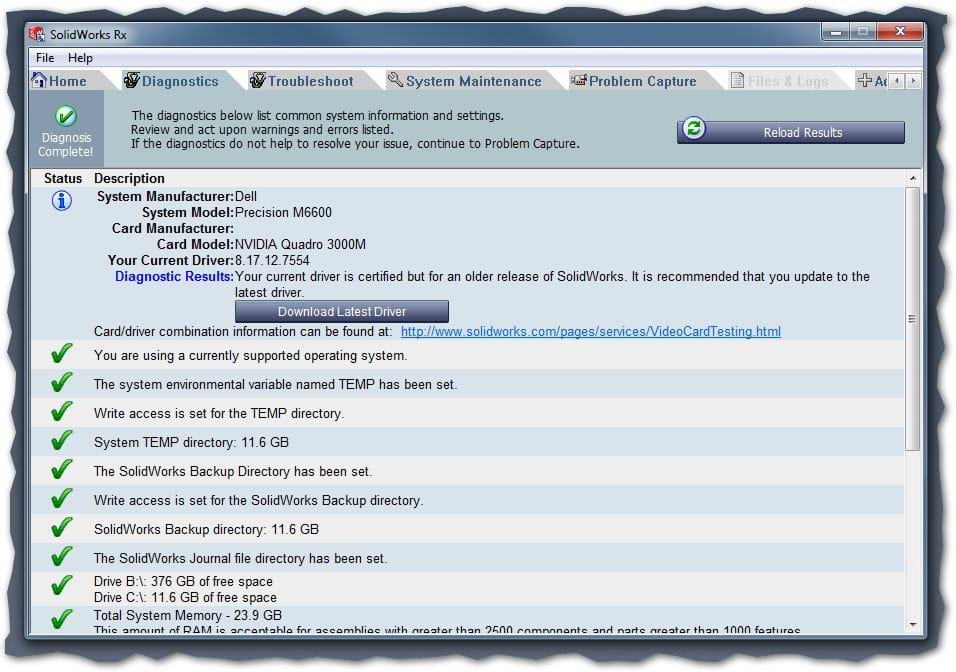 In this you will notice a TAB called Diagnostics and here with an active internet connection you will be able to check if the driver is supported for the Version and Service Pack of SOLIDWORKS.