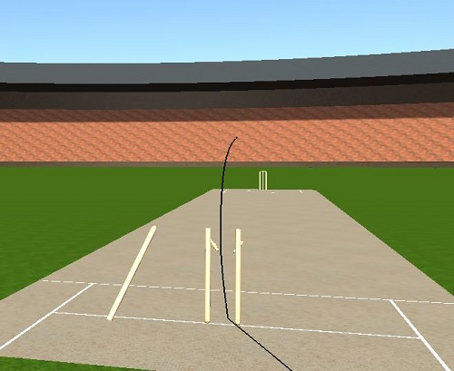 I wondered what that would look like and decided to knock up a quick Motion study in SOLIDWORKS. Since Motion uses real-world physics to calculate the movements, it is an accurate simulation of what really happens. I added an initial velocity to the ball of 95 mph at 2 degrees from the horizontal and at about the correct height. I added 'Contacts' between the ball, pitch and stumps and after a little adjustment knocked the stumps over.