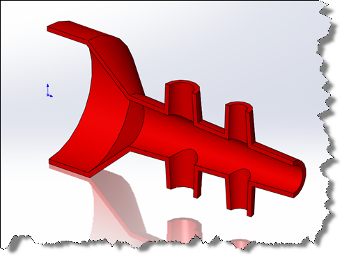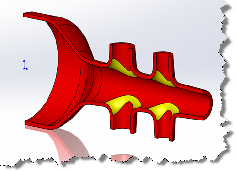 Why not use the feature after adding circular bosses and removing multiple faces in one command? In the following image I have added circular bosses out from the funnel. By removing all of the ‘outlet’ faces the shell tool effectively produces the channels within the part without any calculation. Looking closely, notice the internal channels also follow the draft angle of the circular bosses.