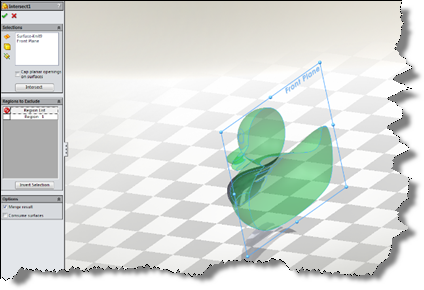 Once I was happy with the surface model I now wanted to turn it into a solid. So to do this I decided to use the insect tool with the front plane this will give me a solid model of the area between my surface model and the plane.