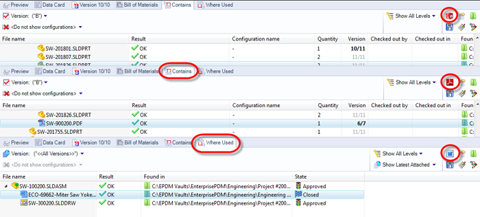 When you select any file reference within the Contains or Where Used TABs you may notice an icon in the group of icons to the right of the bar that changes to the icon for that file type. This is actually a command button that will open the file in the application associated to that file type, as indicated by the displayed icon. In the image below you can see a SOLIDWORKS file, PDF and Word Document displaying the associated Icons.