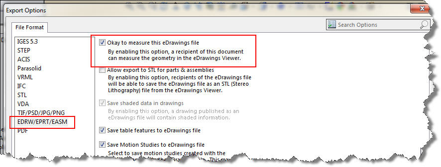 The software can open native SOLIDWORKS files, and also files can be published\saved to the eDrawings format where options such as measuring can be enabled/ disabled.