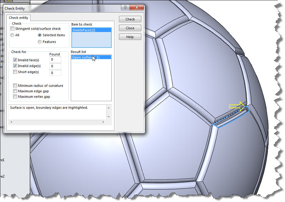 Well generally it is down to an opening which means the model is not water tight (or air tight in the case of the football) and we have to identify this region to close the gap. On very complex models identifying this opening is quite tricky as it could be very small. A utility we can use is the Tools > Check feature- this helps identify open edges and points them out with a yellow arrow. This will focus in on an area that subtly has blue edges as oppose to the normal black edge we see elsewhere on the model. As soon as you close this dialogue window for the Check tool, the arrow disappears so you would have had to zoom in to ensure you do not lose track.