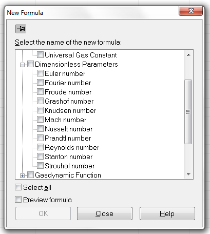 This opens up a table much like a Excel spread sheet. It will initially be empty but you can start adding formulae by clicking on the fx icon at the top of the sheet. This opens up the library and you can browse to a host of common equations. Below I have shown the ones for the dimensionless parameters ...