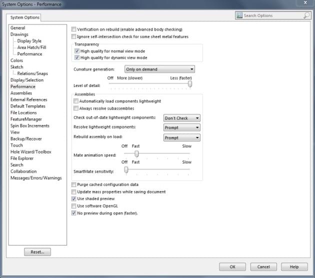 SolidWorks settings for optimised performance speed