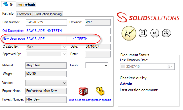 The other thing that we need to bear in mind when it comes to an Input Formula is that, currently, a Formula will only evaluate if one of the Variables in the equation changes via manual intervention, which in this case means I have to Check Out the Part and make a Change to the 'Description' (this could literally just be hitting SPACE then DELETE) in order for the formulas to both update as below...