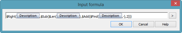 Getting the data from the Right of the hyphen is a little more tricky since the 'Find' function works from the left and starts it's count from '0'. There is also a space alongside the hyphen that we want to remove from the final string. To create this variable I therefore need to combine quite a few functions that allow me to determine the complete length of the Description and the position from the left of the hyphen. I then need to Subtract these to determine the letters to the Right of the hyphen whilst also adding '2' to ensure we ignore the hyphen and the 'space' in the result. The final function now looks like....