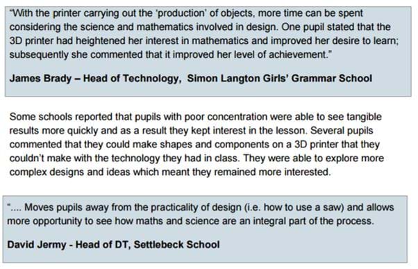 However, the importance of good Design Technology teaching, with up to date technology has been clearly cited by the Schools Minister Nick Gibb who said: "We need to keep pace with employers' demands for high quality, up-to-date technical education - so businesses can thrive at home and we can compete abroad. The Design and Technology Association agreed with the report's findings that ongoing high-quality training was essential for the effective teaching of design and technology.