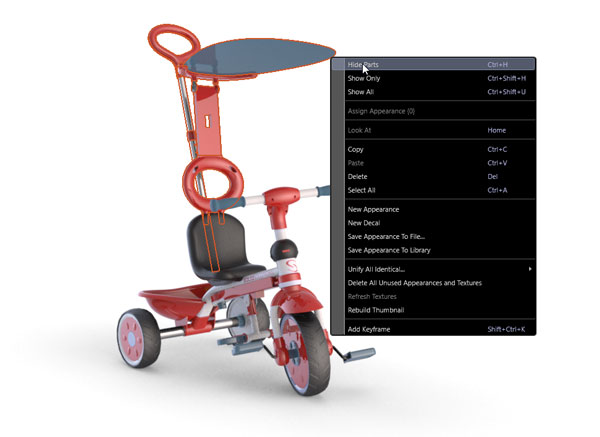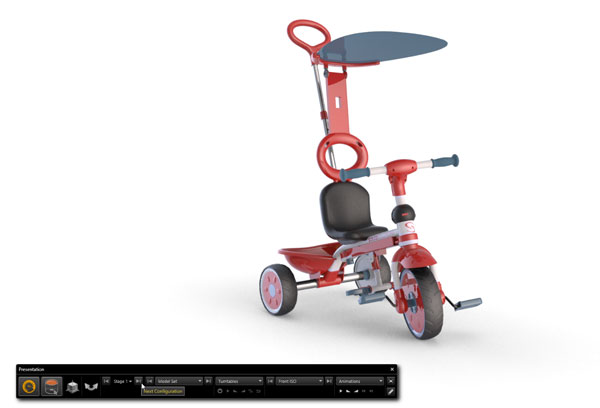 Configurations can also control visibility of components, lighting, backdrop setup as well as associating a different camera view to the configuration.   Next we add additional Configurations that represent the different modes/ stages of this type of trike that changes as the child grows. We simply hide items that we don’t need in the various versions either from the screen or Objects tab (Feature Manager/ Design tree in SOLIDWORKS terms)