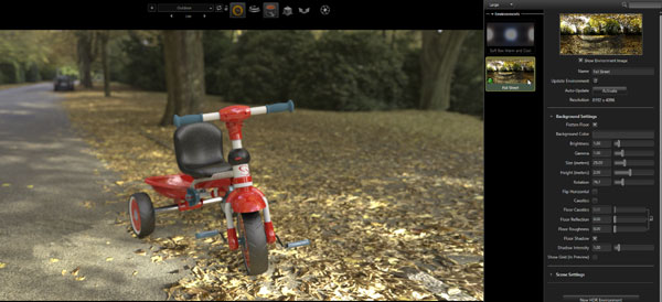 Finally we can create different shots for instance using a realistic HDR image or for lighting and the backdrop.  Simply select and manipulate the environment you wish to use. This configuration also uses a different camera, which is again is stored per configuration.