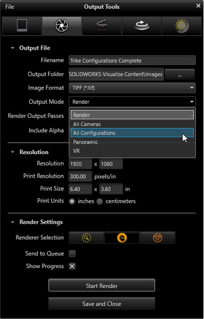 These Configurations can be output on mass easily from the normal render command, simply choosing the “all configurations” options from the “Output Mode” drop down.