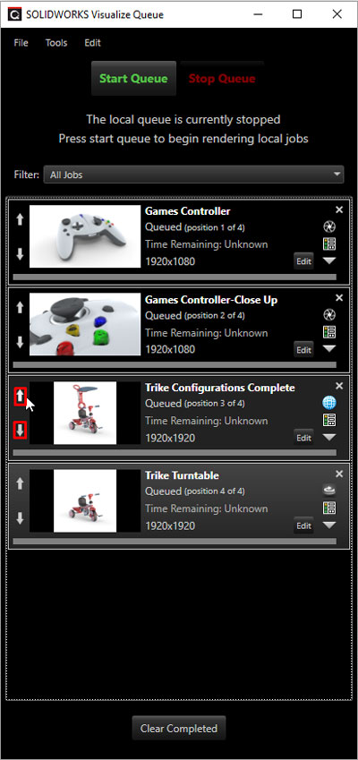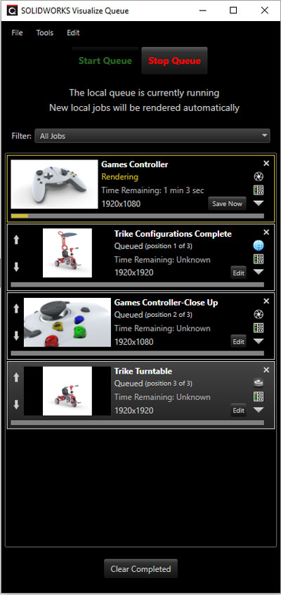 You can also move jobs up and down the tree and stop the queue if needed and even edit the settings before they start. Below I have added different renders of the same model (render all cameras is also available) plus render all configurations of another plus a turntable animation. I can decide to move a job up the list to give it priority