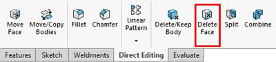 Delete - deletes a face from a surface body or deletes one or more faces from a solid body to create a surface Delete and Patch - Deletes a face from a surface body or solid body and automatically patches and trims the body Delete and Fill – Deletes faces and generates a single face to close up the gap