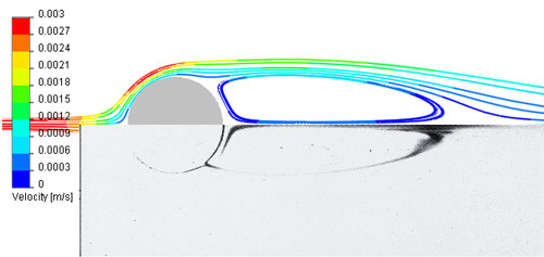 The example used in the validation looks at low Reynolds number flows, which produces two steady vortices formed symmetrically behind the cylinder. The image below shows the flow trajectories of result of the FlowSimulation above and an image of such flow below for comparison.