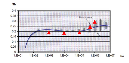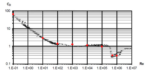 The blue line is the empirical data and the red triangles are SOLIDWORKS Flow Simulation results. As you can see it is staying accurate to the data spread. We also see a similar trend with the coefficient of drag against Reynold’s number plot.