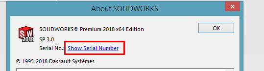 SOLIDWORKS serial key. You can find this within the software if you choose Help > About SOLIDWORKS > Show Serial
