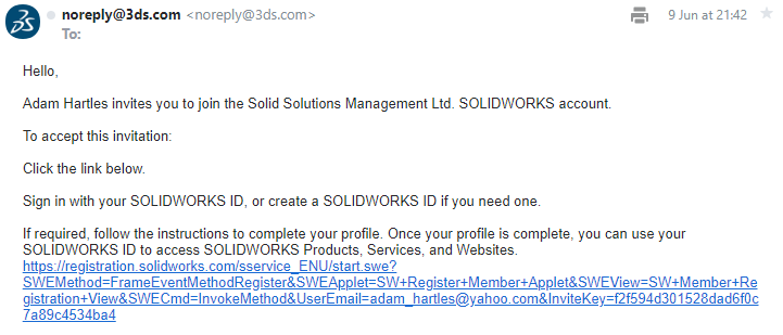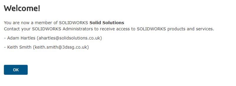 Whilst a link is given to validate the existence of a SOLIDWORKS account for the invited user (called a SOLIDWORKS ID), their login won’t give access to the Admin Portal itself and instead show a page similar to the below advising who their Admin users are.