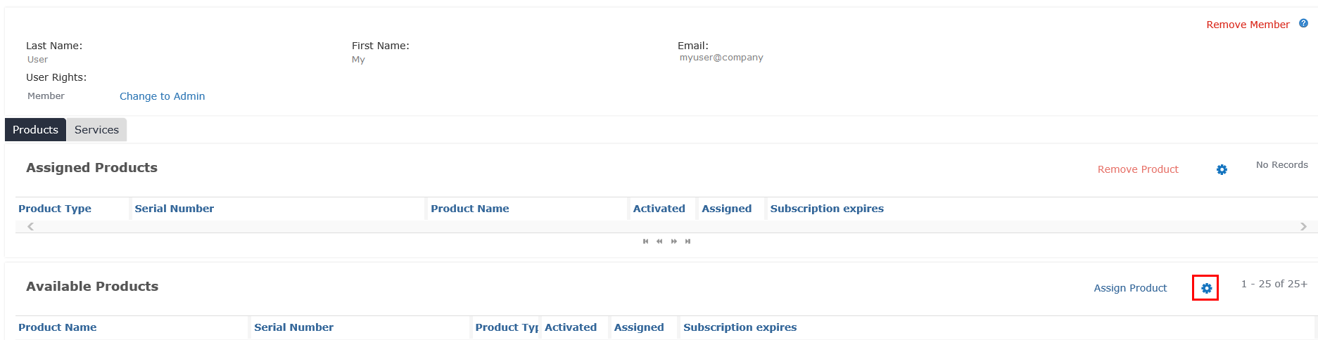 So below I have a staff member called “My User”- this is a new user I have invited in so they have no assigned products currently. Further down are the “Available Products”- these are all the SOLIDWORKS licenses associated with your company since they first invested in SOLIDWORKS. This therefore may show older expired products as well as some of the add-ons that come with SOLIDWORKS such as CAM, PDM Standard and Visualize. Because of this you may have a lot of serial key information to trawl through if you have a lot of software, so the gear icon should be used to create custom searches/queries.
