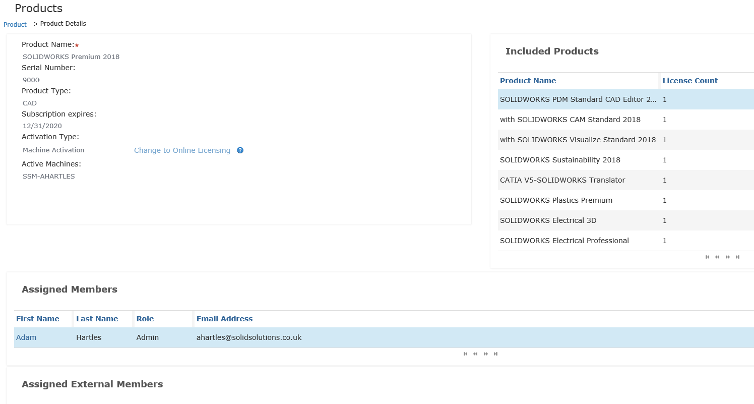 You can see that it shows this license is using the traditional “Machine Activation”, is active on my computer (and shows the name of this) and has myself as an Assigned Member. There are also some “Add-on” products with my SOLIDWORKS key to give me access to more modules. You may or may not see these depending on what you have purchased. There is also a section for “Assigned External Members”. If any of these are listed it can prevent you from doing certain things like changing to an Online License. These External members are legacy details which have related to the license key in the past. They may no longer be active employees, so if you see these you cannot remove them yourself, and will need to contact us so we can have SOLIDWORKS remove this user from your account. As a reseller we have no direct access to your Admin Portal unless you share your login details with us.