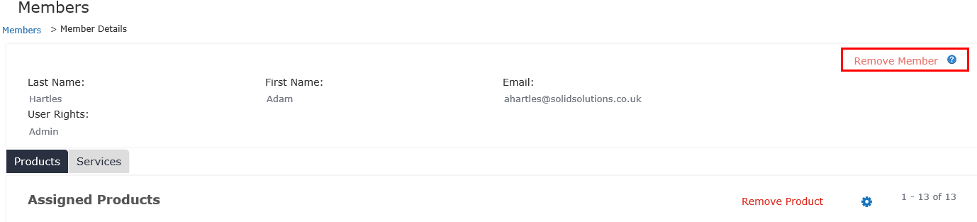 If you need to remove a member, click into them and the option to Remove Member is in the upper right corner. Notice the “?” tooltip- it will state that a member cannot be removed until all products are removed from them. This can be done via the “Remove Product” link in red text further down the page.