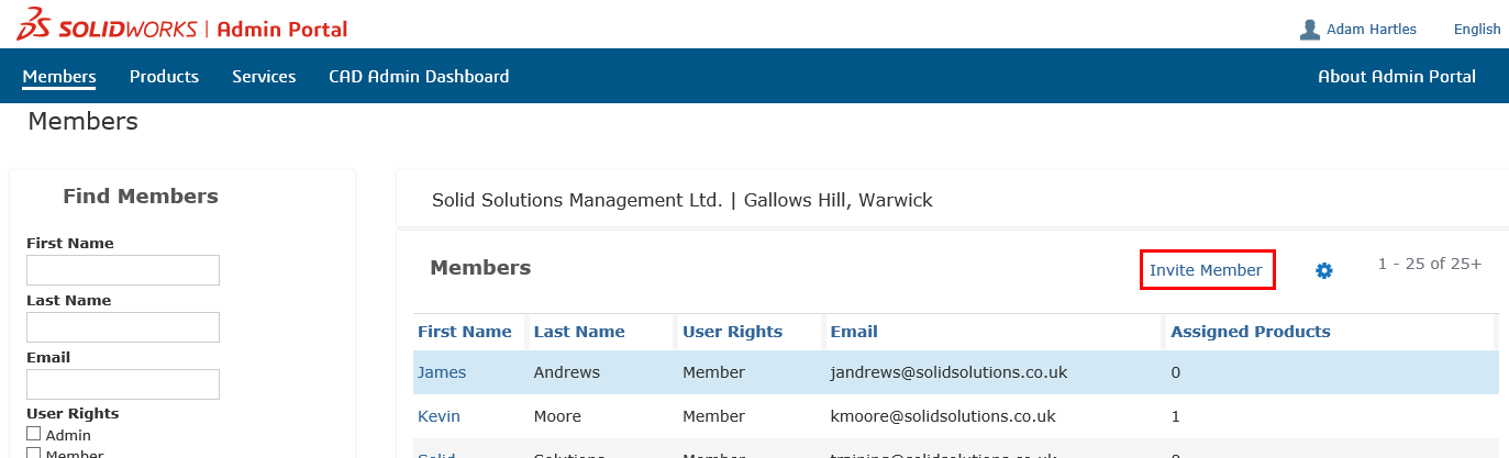Members - this is simply stating that said user is part of your organisation and uses SOLIDWORKS. These individuals can then be associated with SOLIDWORKS serial keys and also have their software changed to the online licensing method. It can also help automate the installations of SOLIDWORKS as their serial key information can be pre-set from the Admin Portal.