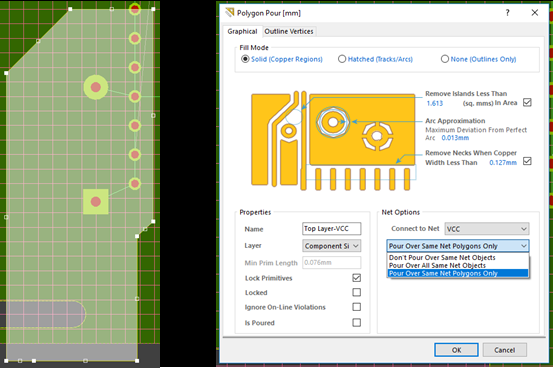 Within SolidWorks PCB, you can define Copper Pour polygons. These polygons can be on a net, in-filled solid or hatched and have a series of settings to ‘flavour’ the result: