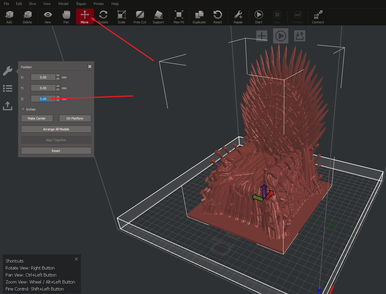 As the model has a large rectangular base we increased the Z position of it slightly, this causes the software to automatically add a layer of support material. This helped minimize the risk of damaging the component when separating it from the build plate.