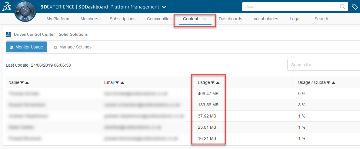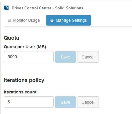 | Either by launching the “Drives Control Center” app (North part of the Compass for Admins), or using the Platform Management option from the main toolbar pull down, you can review the “Content” for each user and manage their settings to allocate the amount of space on a user basis. |