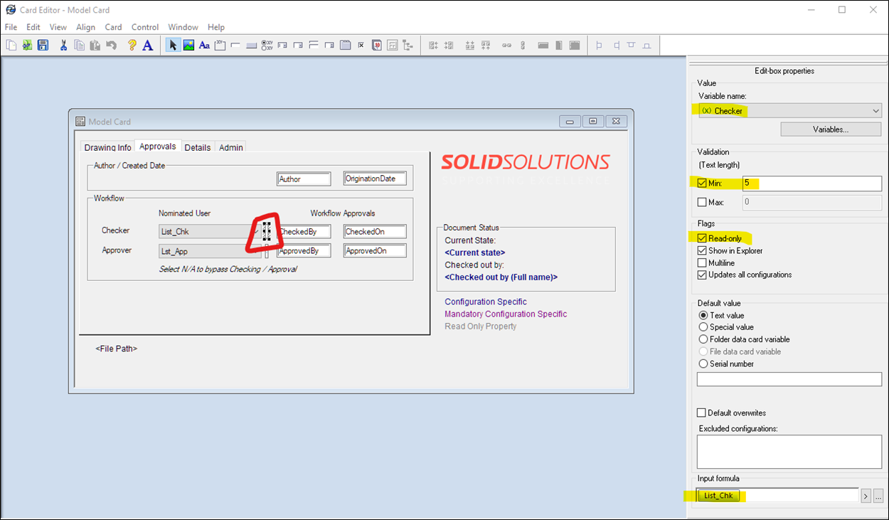 For the demonstration I have added an additional approvals tab to the DataCard for models and drawings. To ensure that the full lifecycle details will be visible in one place, I have initially replicated the existing ‘Author’ and ‘Creation Date’ fields, making them read only and setting the same default values as main info tab.
