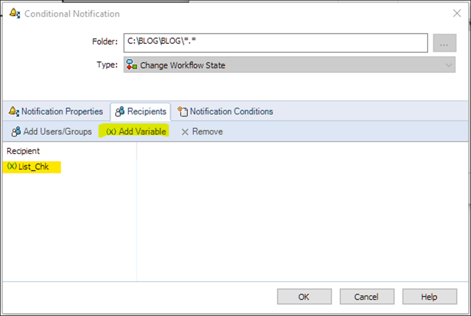 Next, we define the recipient(s). To do this we will read the name from the drop list we created on the DataCard for this purpose. So, we use ‘Add Variable’ instead of 'Add Users/Hroup', and we select our required variable. In my case ‘List_Chk’