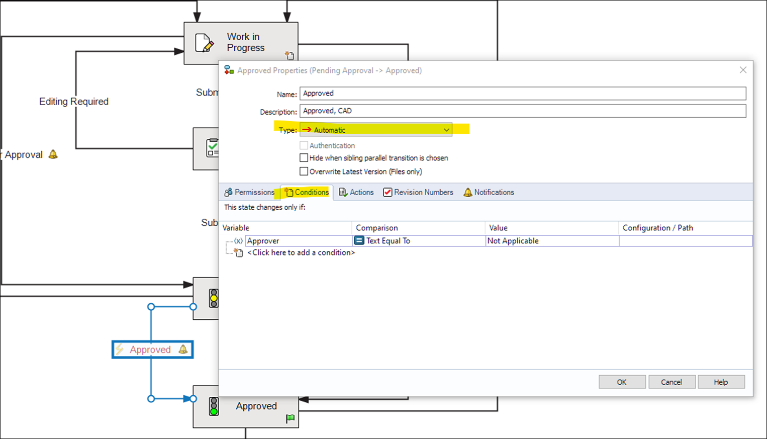 Finally, If the user selects a checker but 'Not Applicable' for an approver we need to automatically route from the pending approval state through to approved. This is done by adding a second ‘Approved’ transition, set to automatic, but with the condition that the approver variable is ‘Text Equal To’ 'Not Applicable'.