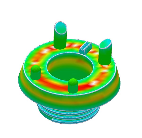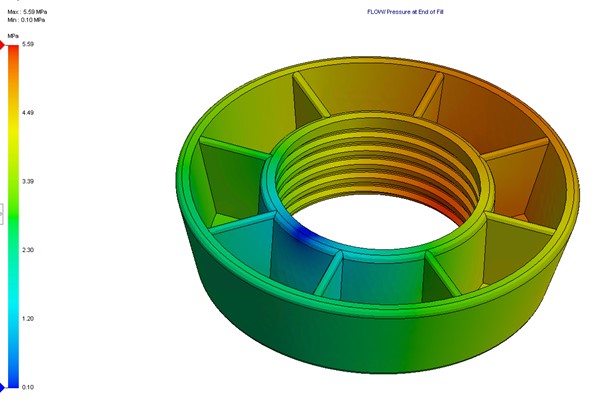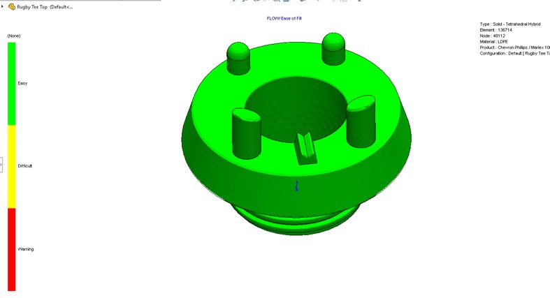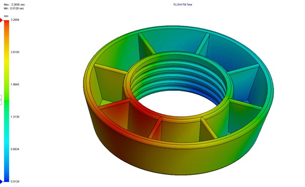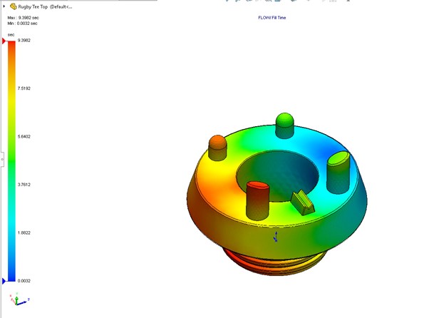 Next all we have to do is run the study, this study took minutes to run and from this we can see straight away from the ease of fill plot if this will fill on our machine using our selected material. In this case we can easily fill this geometry.