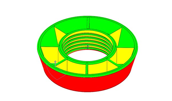 Below we can see positive and negative draft in red and green however we can also see on this model the ribs currently have no draft. So, depending on the location of the parting line this maybe something we need to address to ensure we can get the product out of the mould.