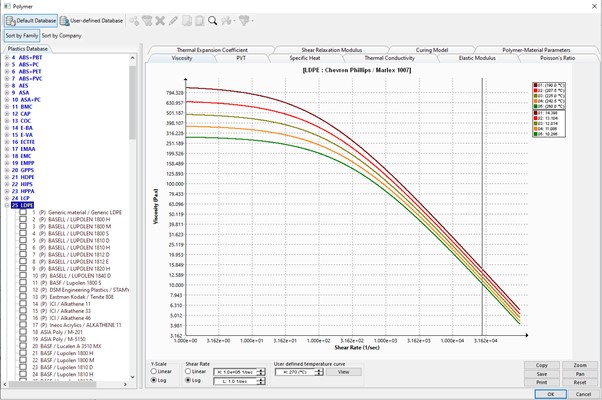 The set up in SOLIDWORKS plastics is quick and easy we just need to select our material from the HUGE plastics database. This contains a lot of the information we need such as viscosity, melt temperatures, suggested mould temperatures, Young's modulus, thermal expansion coefficient, density, fiber percentage and much more. Once we have done that, we just set the basic parameters for our machine and then pick our desired injection location.