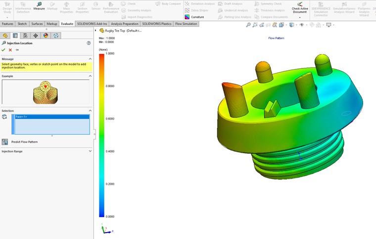 So, from these quick checks we can see that we could make some improvements to this part for injection moulding. We could add more draft in certain areas and look to reduce some of the thick regions for a more uniform wall thickness. But let’s put it into SOLIDWORKS Plastics to see if we could mould this design.