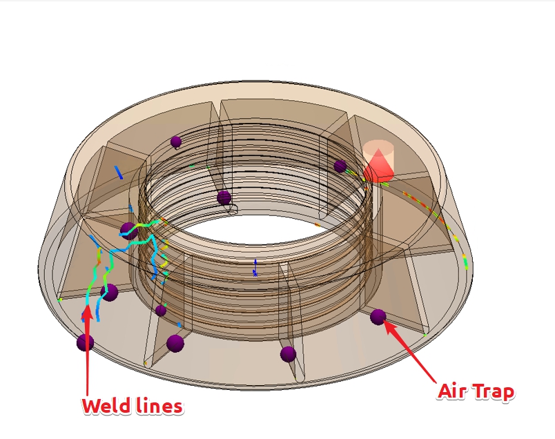 Looking more closely, this model isn’t perfect as there are some sink marks, air traps and weld-lines. We won't touch on them now but normally we would might consider them in further studies.